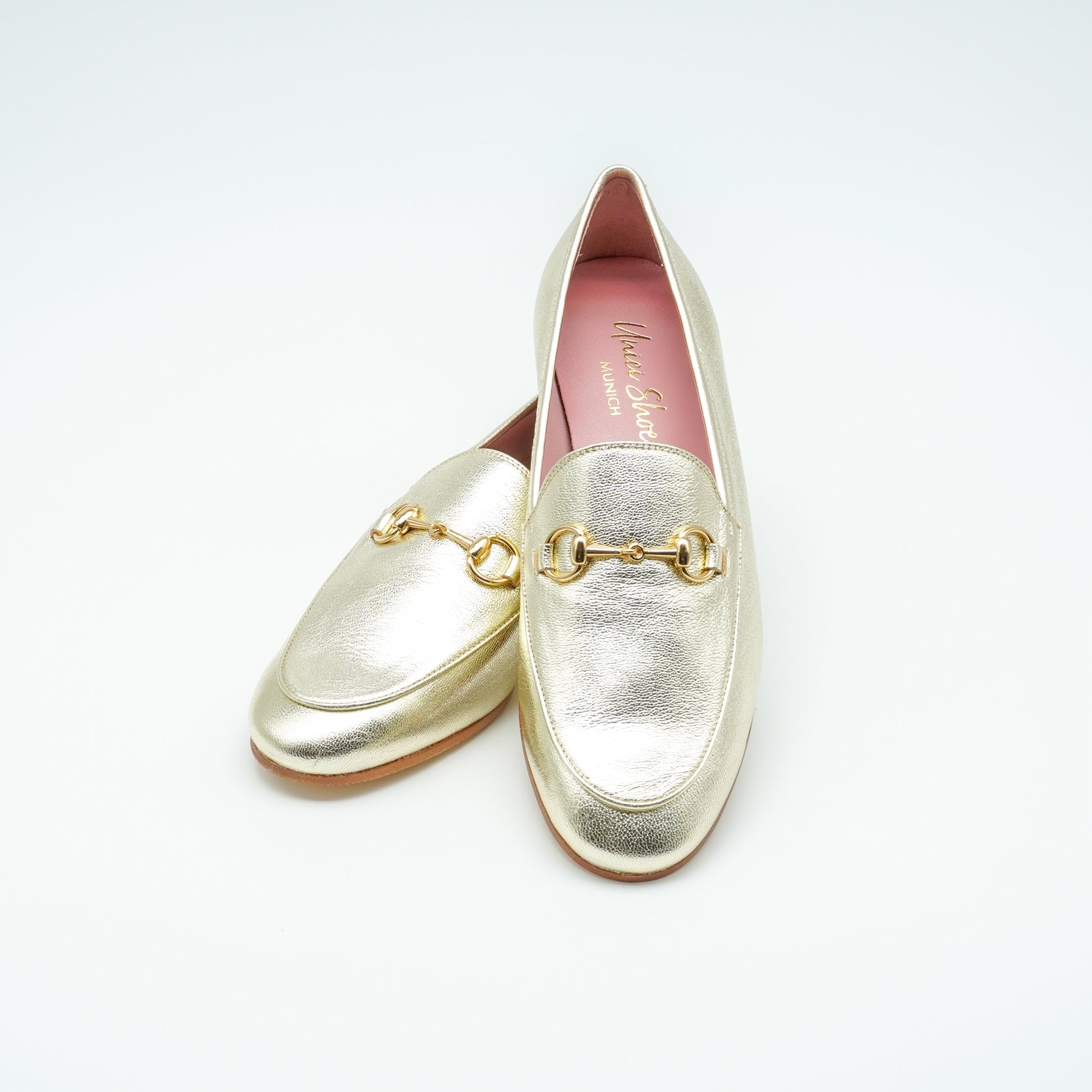 Der Horsebit Loafer Champagner ist aus hellgoldenem Metallic-Leder gefertigt. Das Modell besticht durch sein exklusives und elegantes Design, welches sich zusätzlich durch das dekorative goldene Tresendetail auszeichnet. Dieses luxuriöse Modell macht ein klassisches Outfit noch stilvoller als zuvor; wertet aber ebenso jedes schlichte, casual Outfit auf.